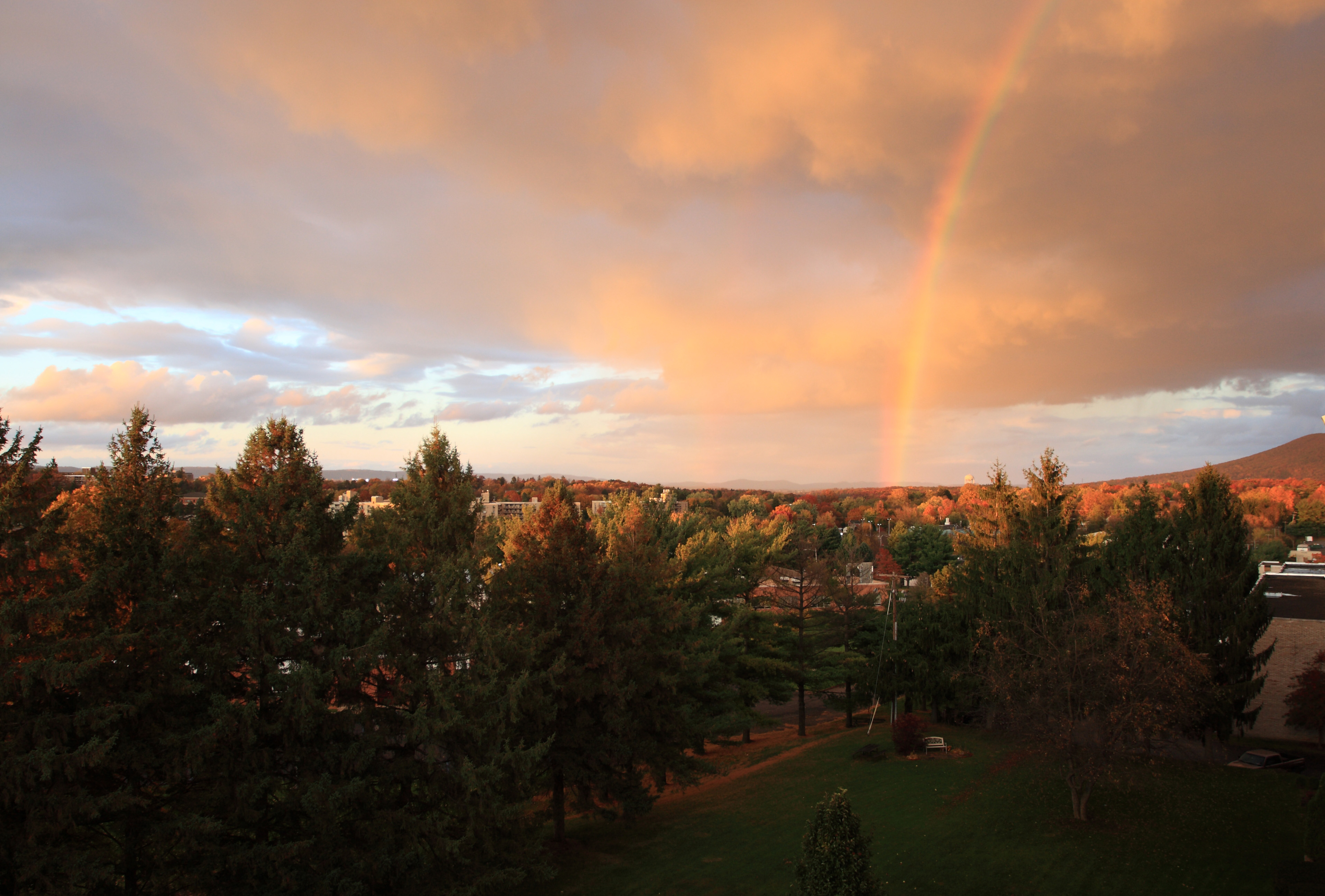 四点,东边的一点乌云开始动作,那雨好像杨枝甘露一样洒落入世,我出来望了下,转身进去。也不知道到了什么时候,我不再听到雨珠落下的声音,决定出来呼吸一些清新,便拉开阳台门,这令人窒息的美丽就出现在我面前。立即转身去拿相机,也管不了那些参数和原则,只是打到av,就着取景器拨F档看着曝光度量走到不负不正的0,擦擦捏了5张,回身去拿录像机,槽糕,只录了几秒钟就没电了,等我再去换了电池出来,刚才的一切好像梦醒归于平常,已然消失殆尽了。
